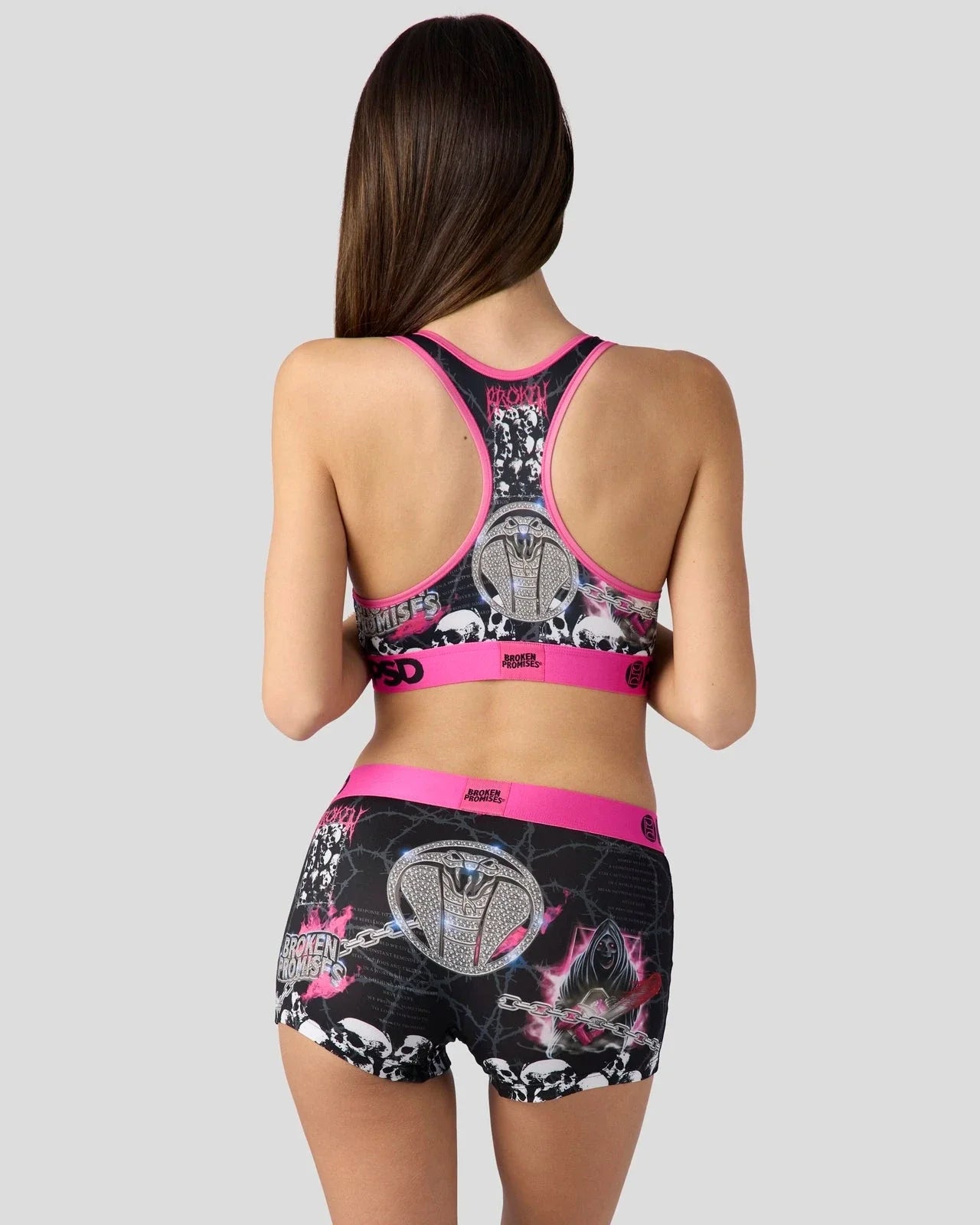 Let your emotions get the best of you with this look from Broken Promises x PSD. The Chainsaw Sports Bra is made from a silky poly blend and is breathable yet slightly compressive, bringing you the comfort and support you need for everything you get into.