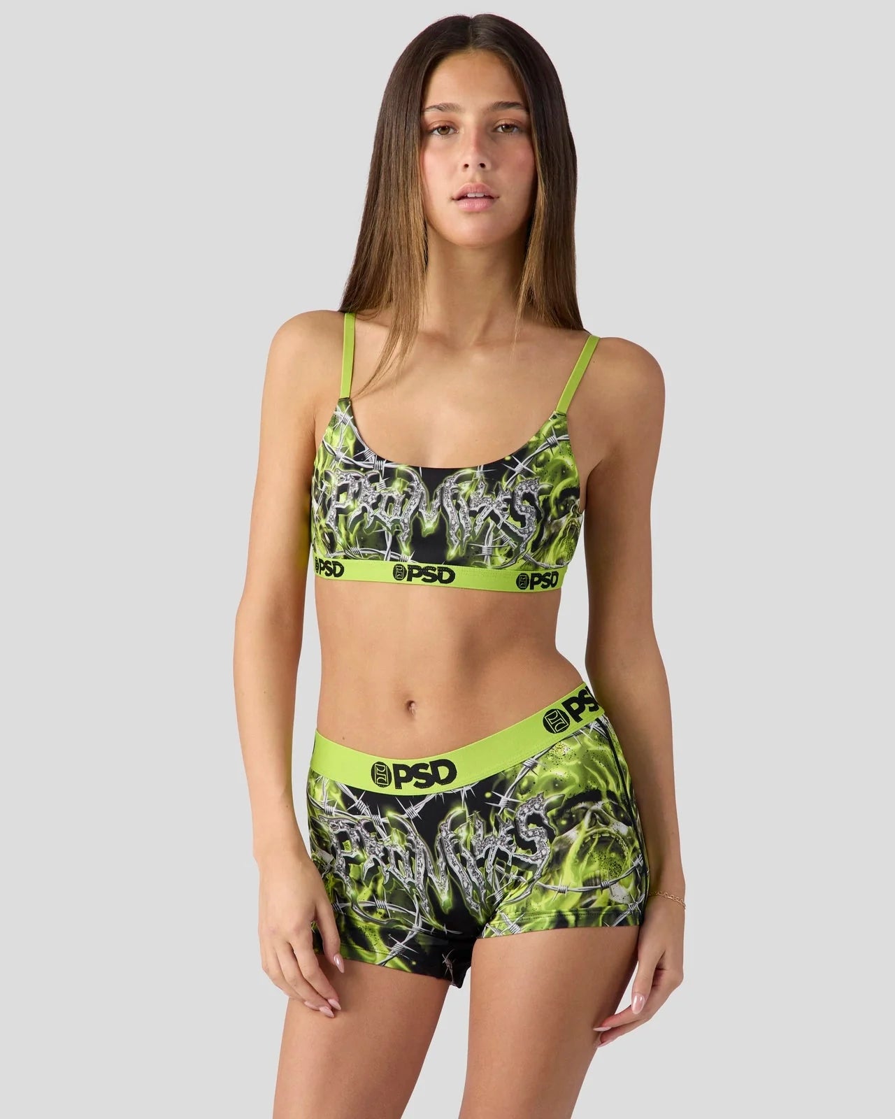 Our first collaboration with Broken Promises is here. Featuring their barbwire print, the Cyberwire Scoop Bralette almost feels like you're not wearing a bra at all. It’s fully lined and features include adjustable straps, a cute scoop neckline, and a soft microfiber band that won’t ride or rub.
