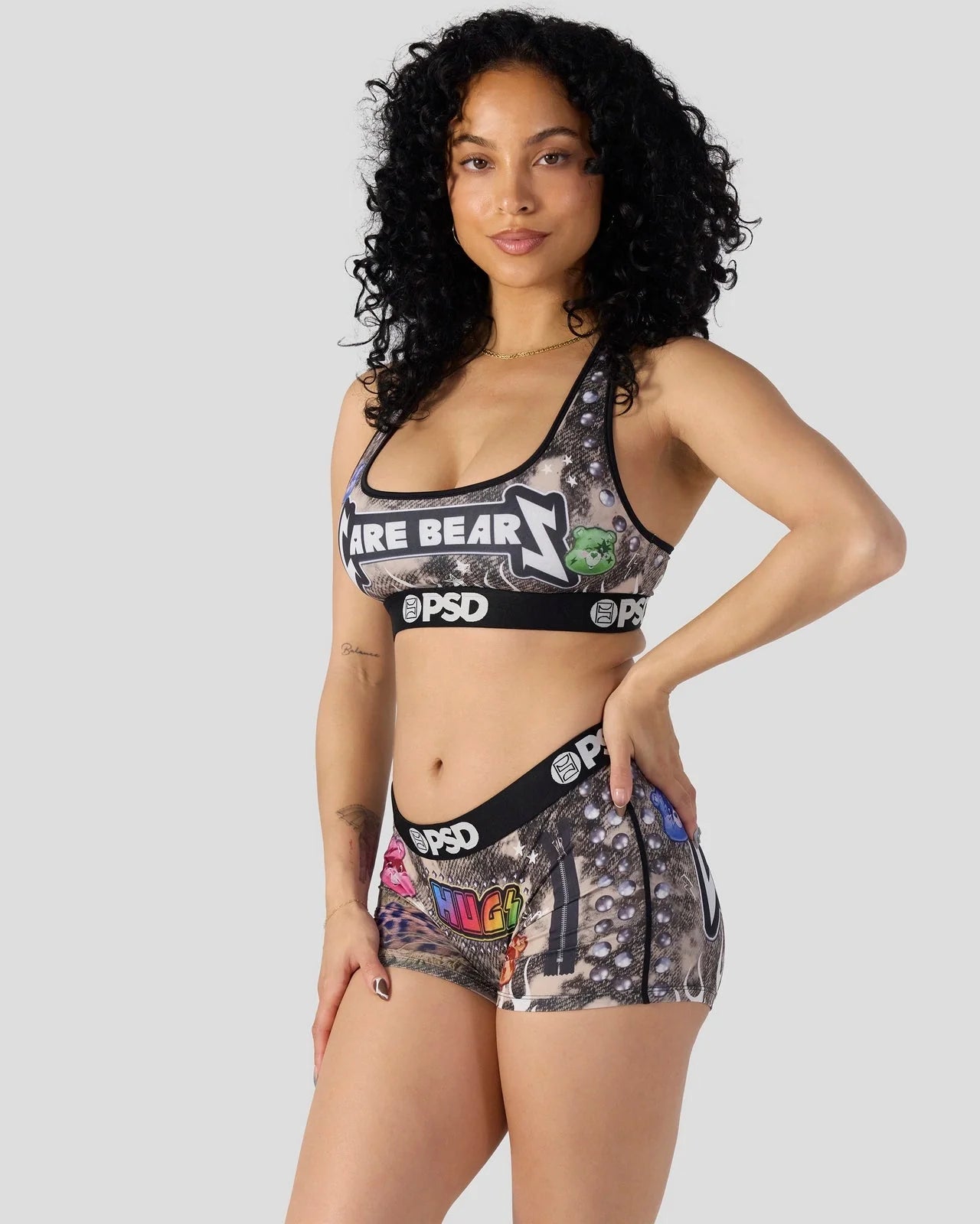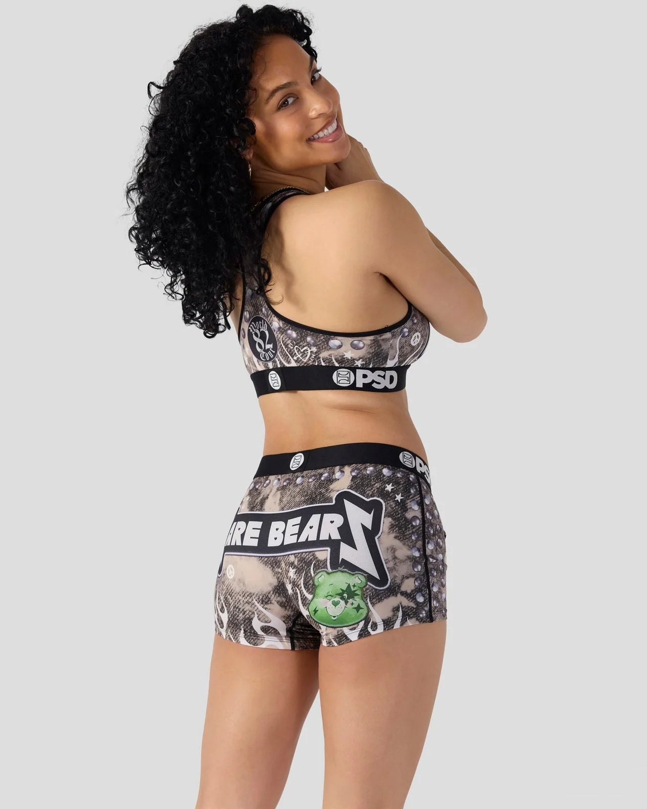 Care Bears go metal in this new look from Care Bears x PSD. The Headbanger Sports Bra is made from a silky poly blend with a comfortable full coverage, keep-you-in fit. The PSD boy shorts are perfect for everyday wear and working out.