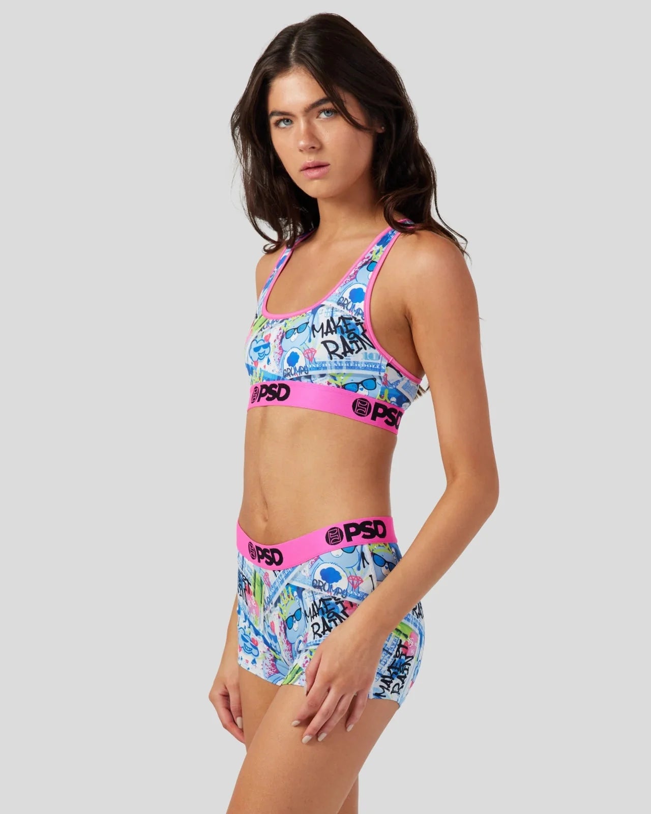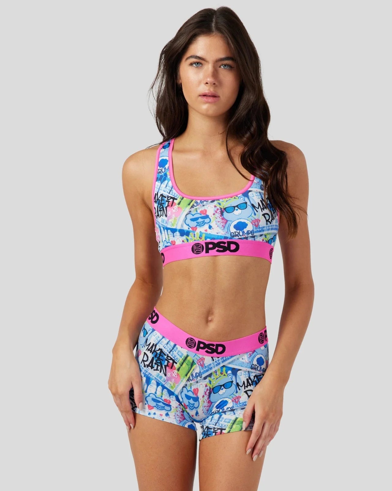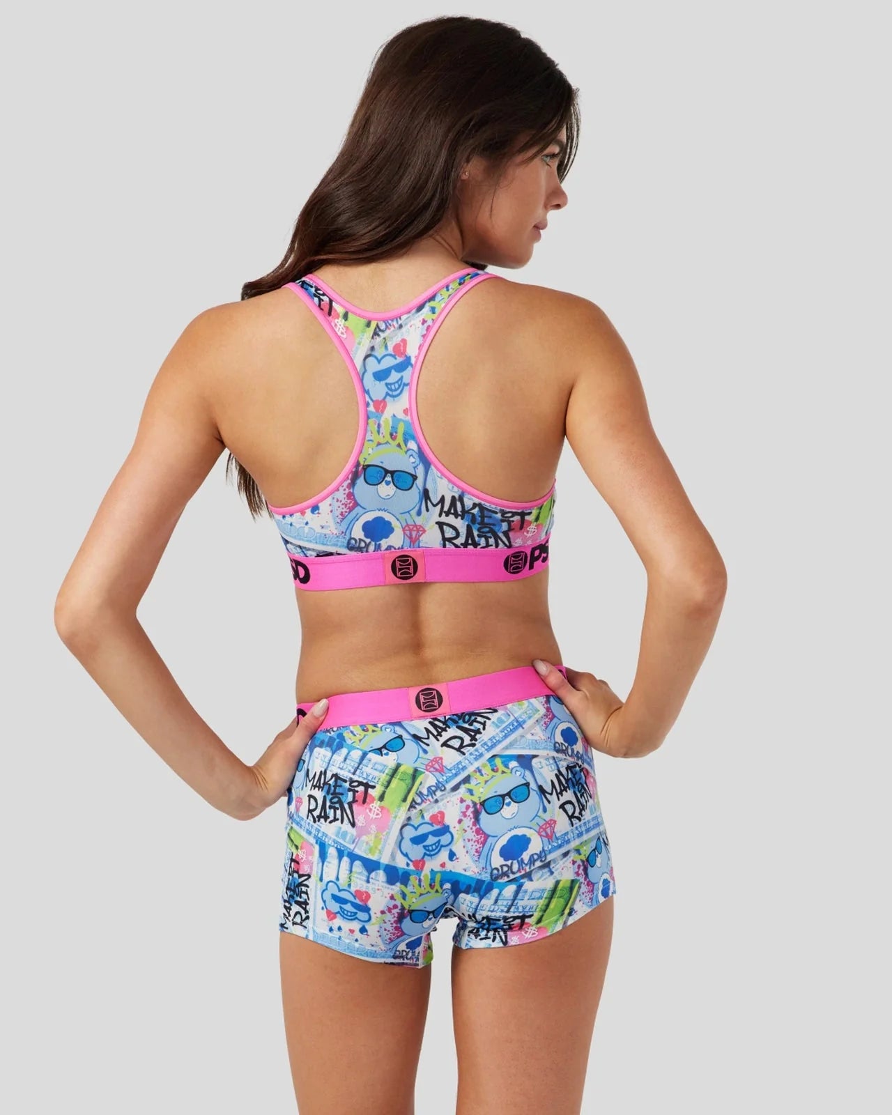 Our newest drop from the Care Bears x PSD collection features your favorite cuddly friends like you've never seen them before. The Make it Rain Sports Bra is made with our silky poly blend and is breathable yet slightly compressive, bringing you the comfort and support you need for everything you get into. This style is available in sizes XS - 5XL.