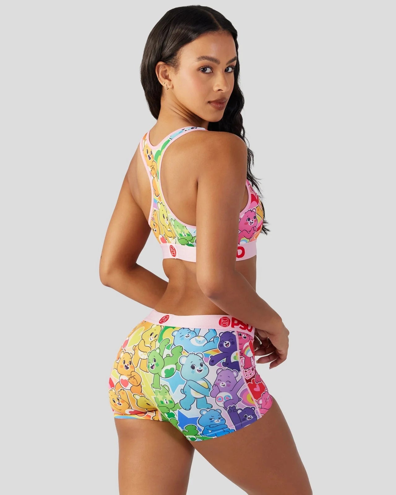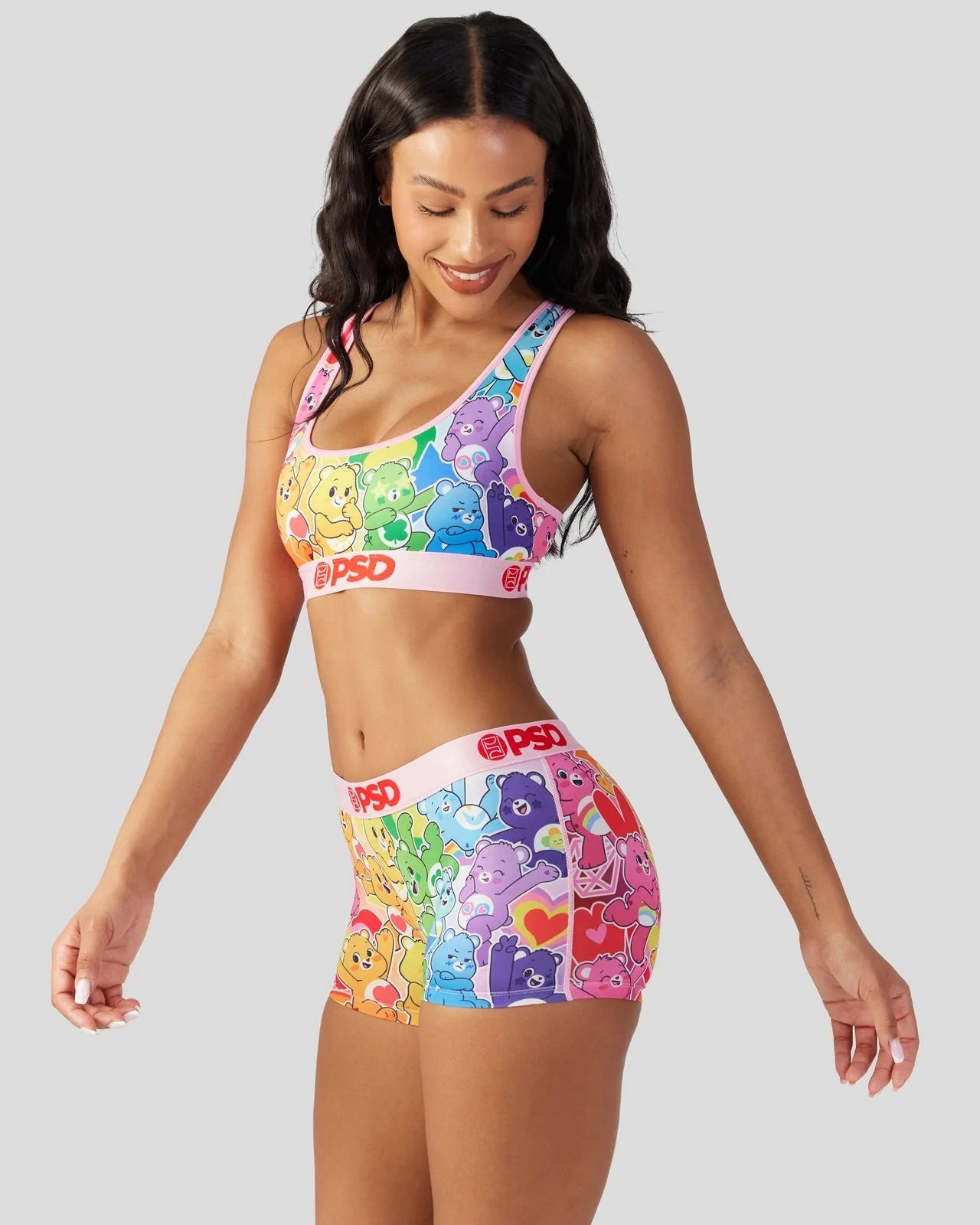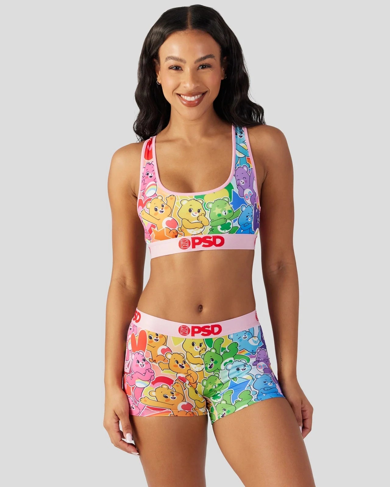Don't miss this colorful new drop from Care Bears x PSD. The Rainbow Sports Bra is made from a silky poly blend with a comfortable full coverage, keep-you-in fit.
