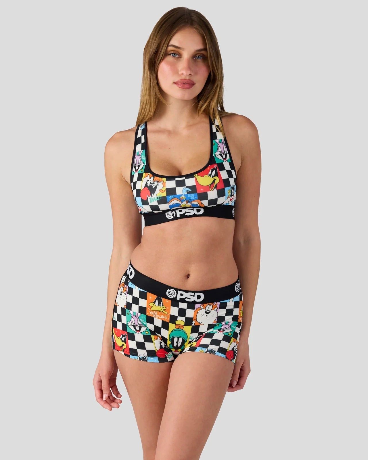 Featuring the whole Looney crew, the Check Boy Short is made from a silky poly blend with a comfortable full coverage, keep-you-in fit. The PSD boy shorts are perfect for everyday wear and working out.
