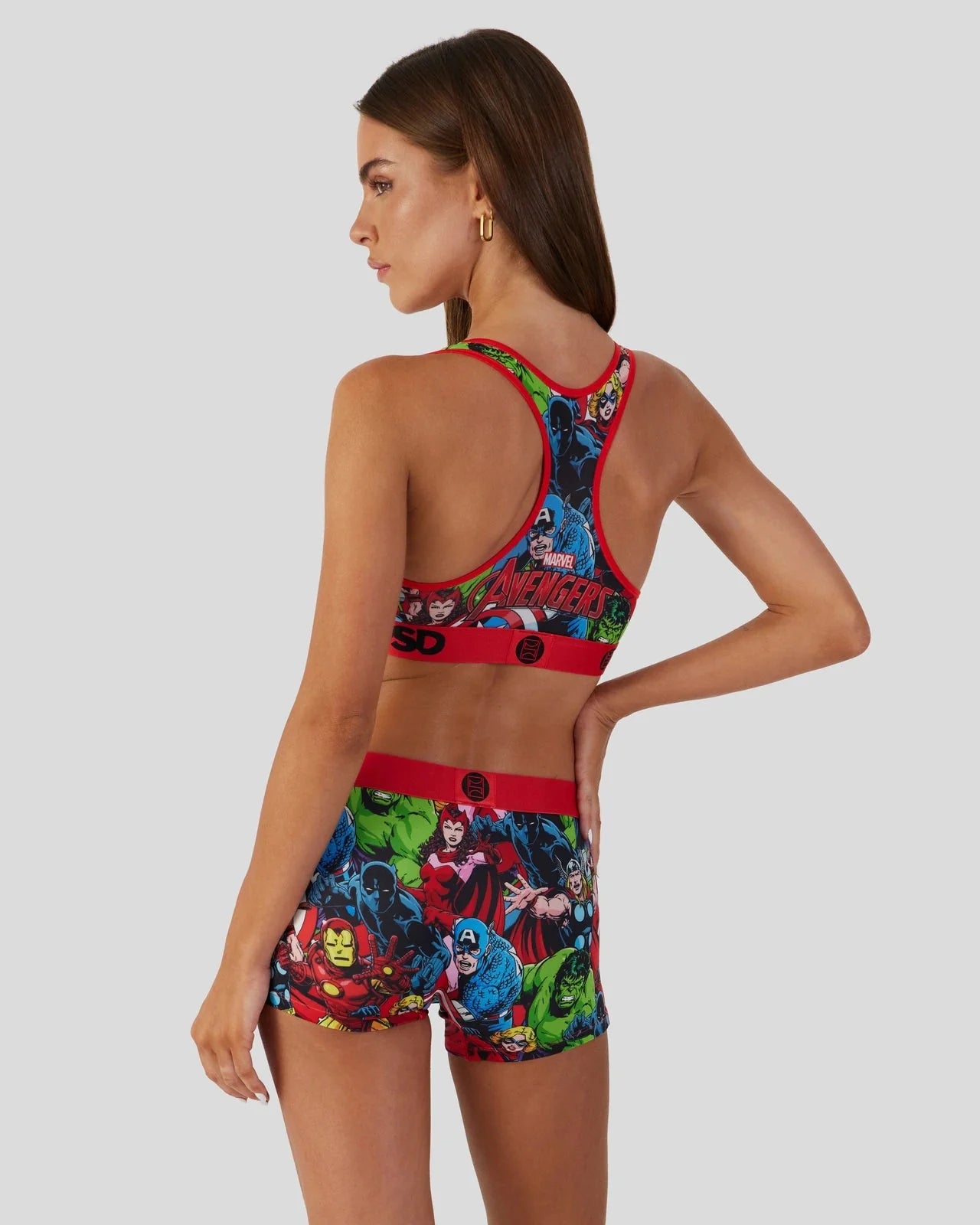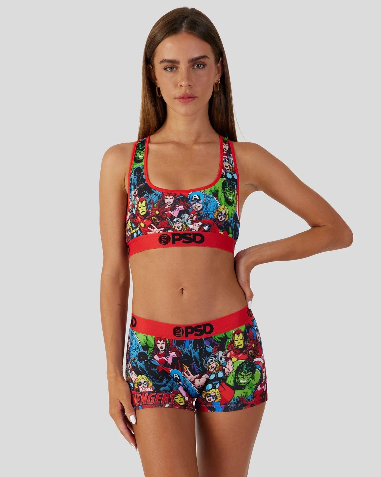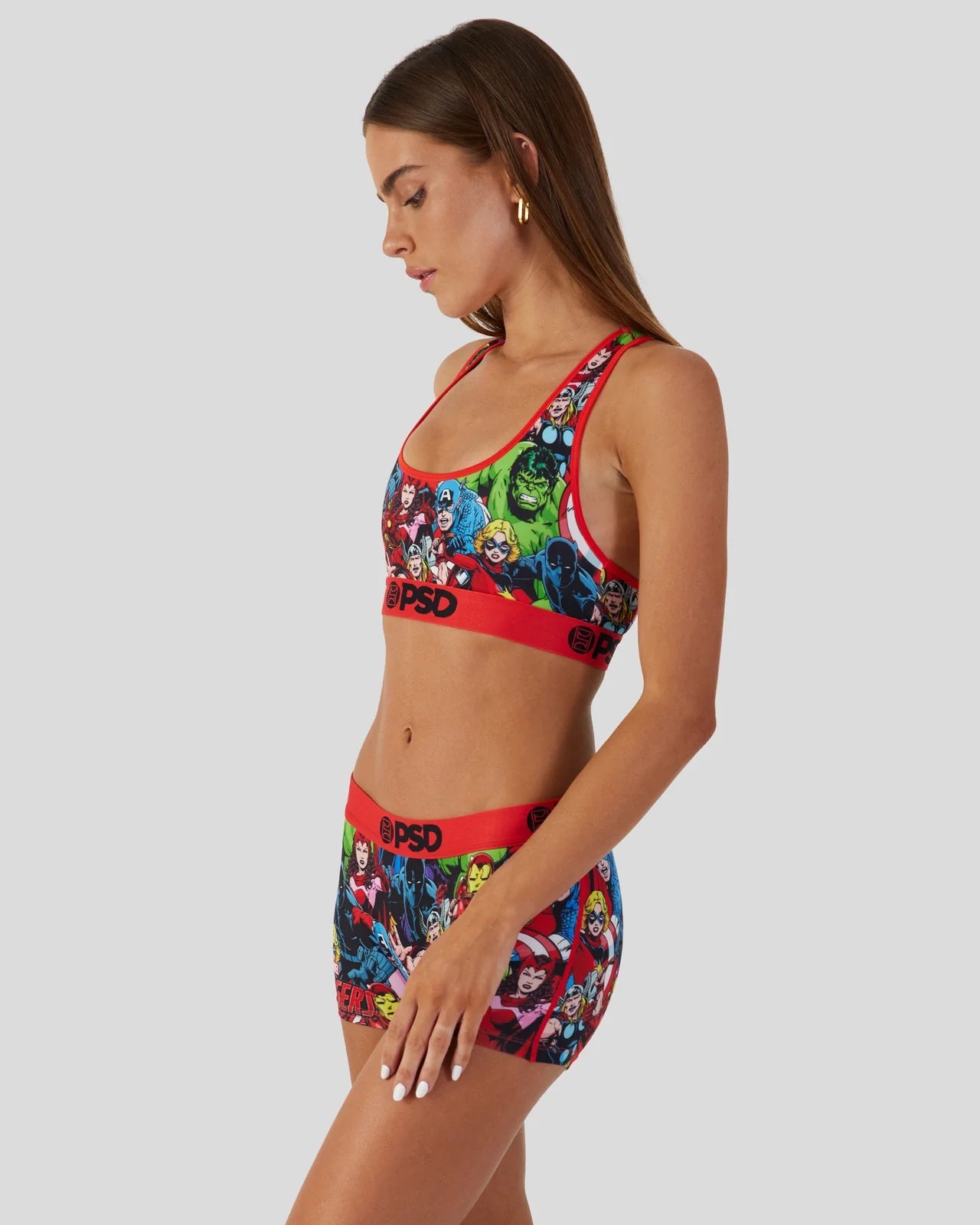 The Marvel - Avengers Sports Bra features members of the Avengers from the Marvel comics assembled in an all-over print that includes Captain America, Black Panther, Iron Man, Thor, Scarlet Witch, and Captain Marvel. Made with our silky poly blend, the Sports Bra is breathable yet slightly compressive, bringing you the comfort and support you need for everything you love to do in life.