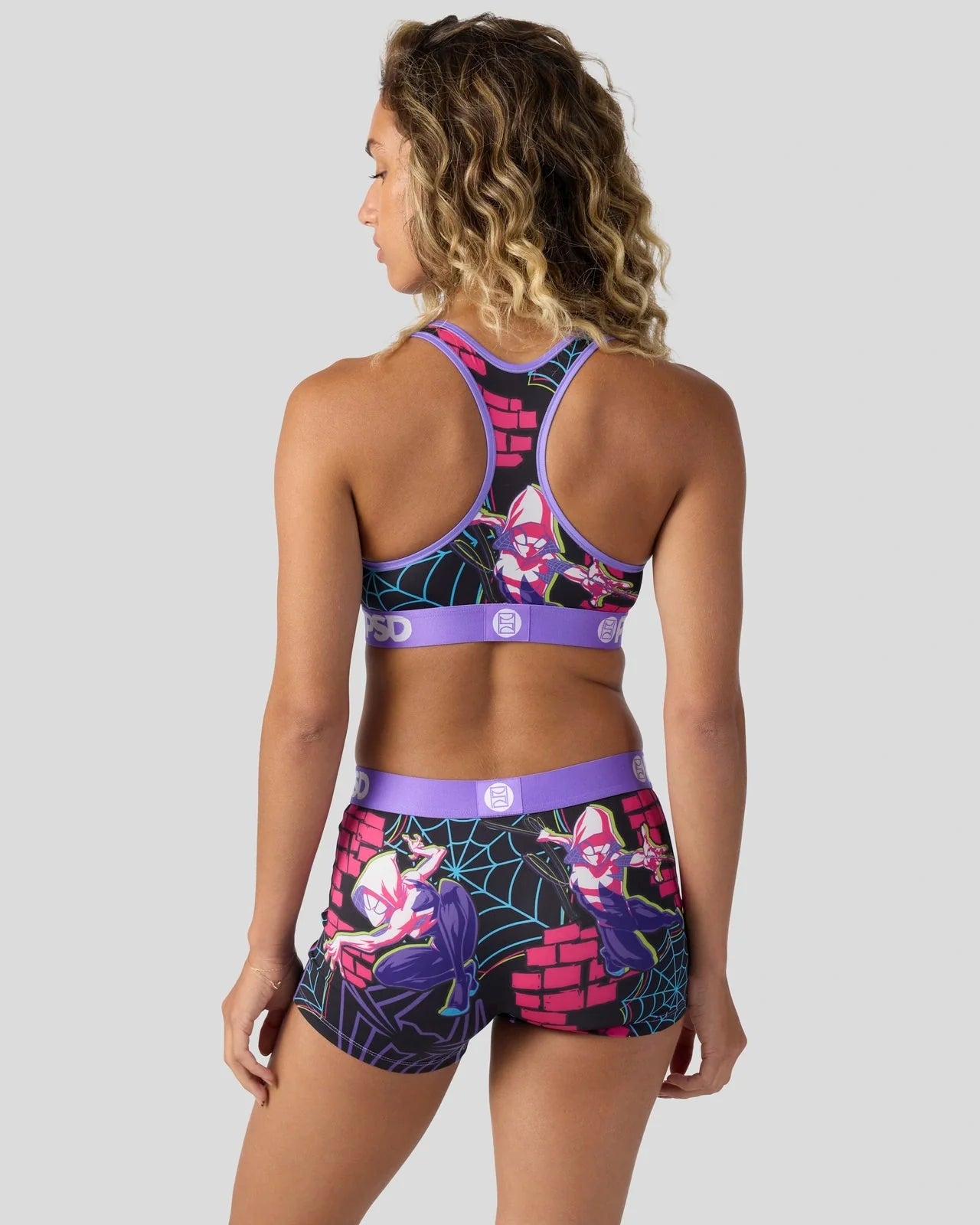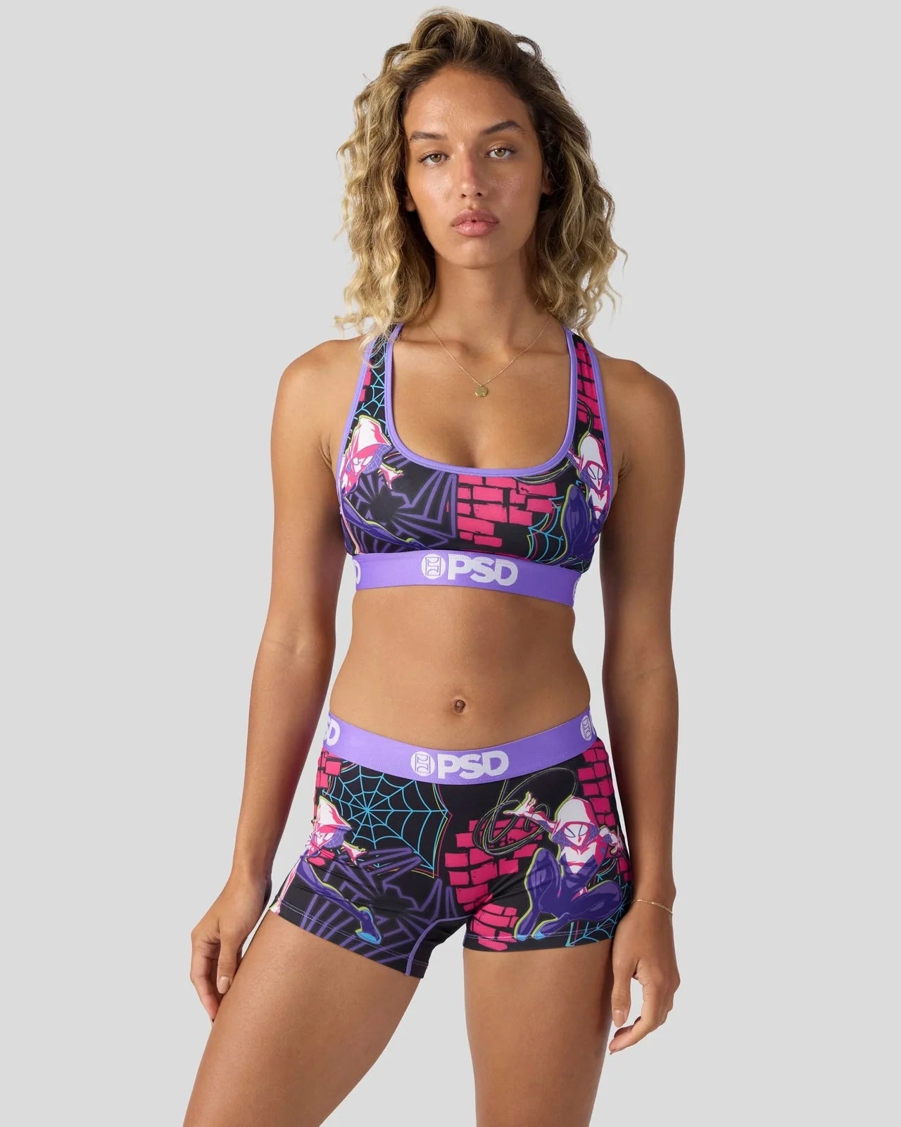 Part spider, all Super Heroine. Swing into action in this new look from Marvel. The Ghost-Spider Pop Boy Short is made from a silky poly blend with a comfortable full coverage, keep-you-in fit. The PSD boy shorts are perfect for everyday wear and working out.