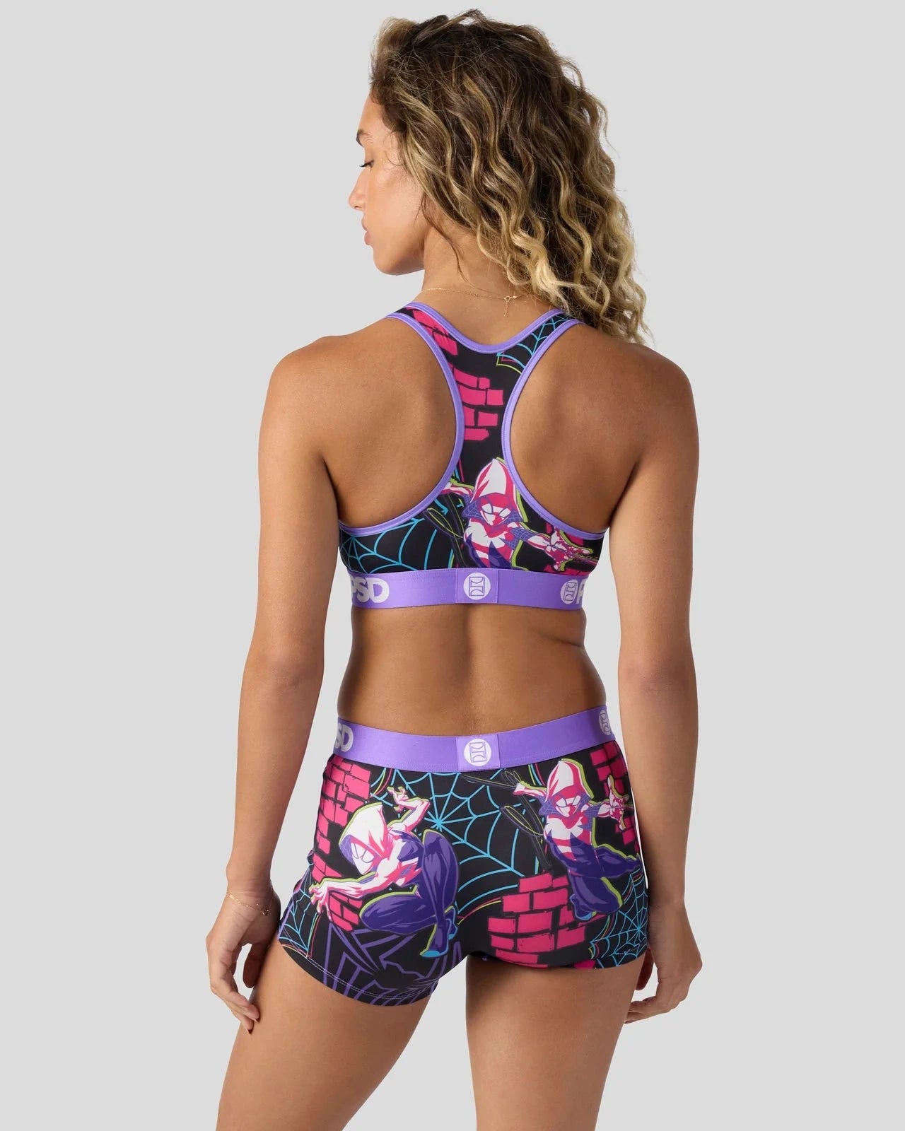 Part spider, all Super Heroine. Swing into action in this new look from Marvel. The Ghost-Spider Pop Sports Bra is made from a silky poly blend and is breathable yet slightly compressive, bringing you the comfort and support you need for everything you get into.