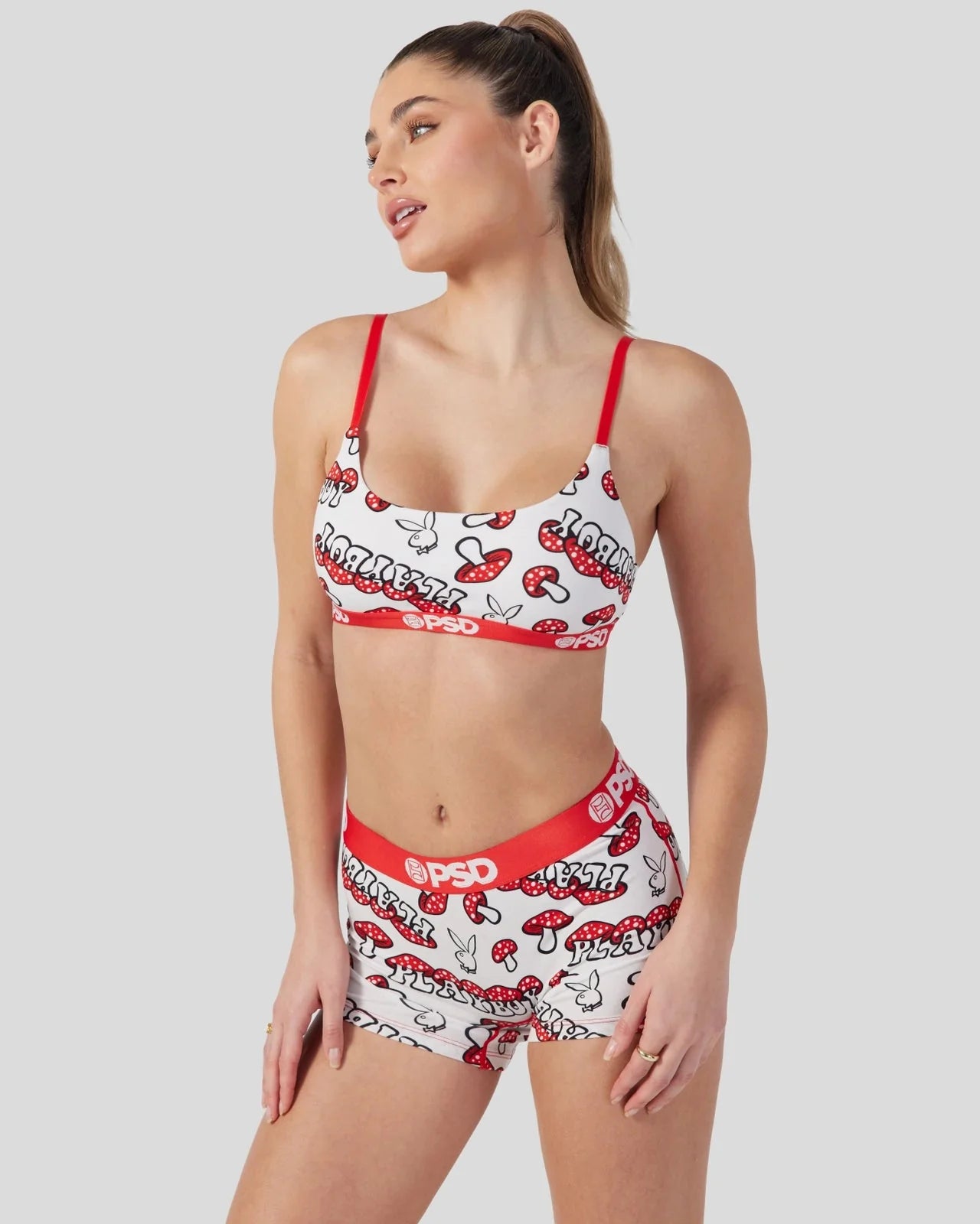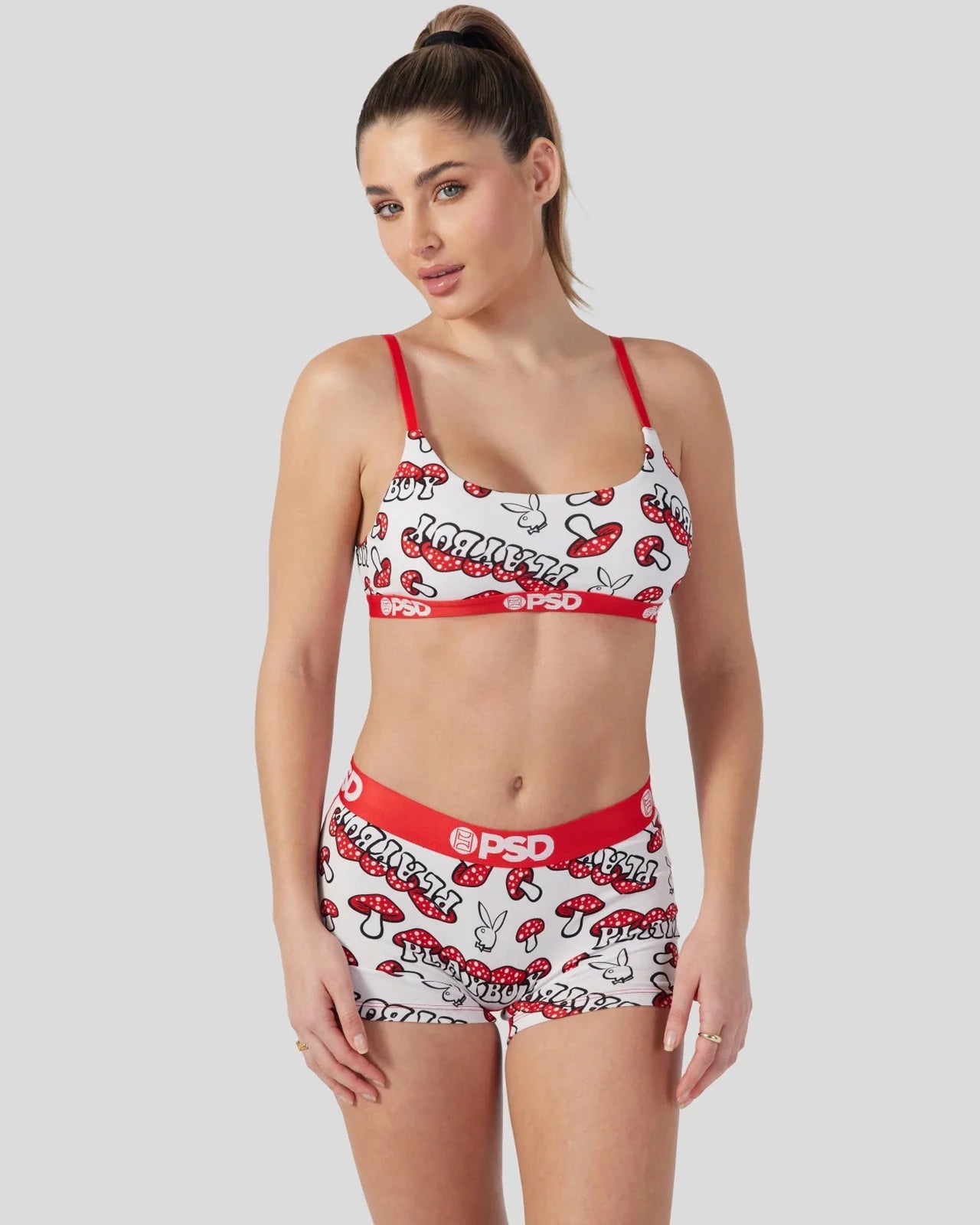 Meet the latest from Playboy x PSD. The Mushroom Boy Short is made from a silky poly blend with a comfortable full coverage, keep-you-in fit. The PSD boy shorts are perfect for everyday wear and working out.
