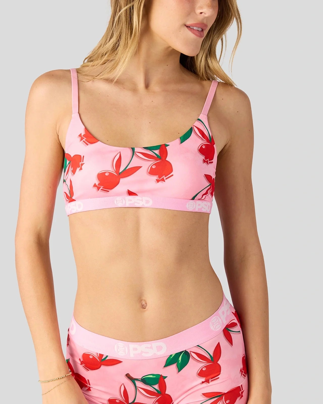 Sweet cherries with an iconic Playboy twist. The Cherry Love Scoop Bralette from Playboy x PSD almost feels like you're not wearing a bra at all. It’s fully lined, and features include adjustable straps, a cute scoop neckline, and a soft microfiber band that won't ride or rub.