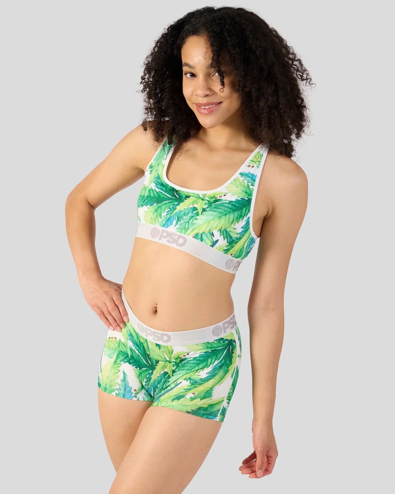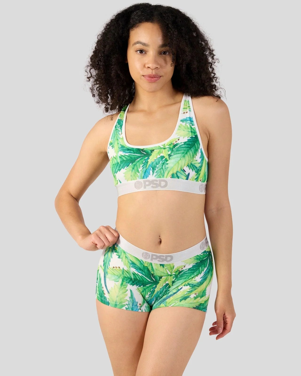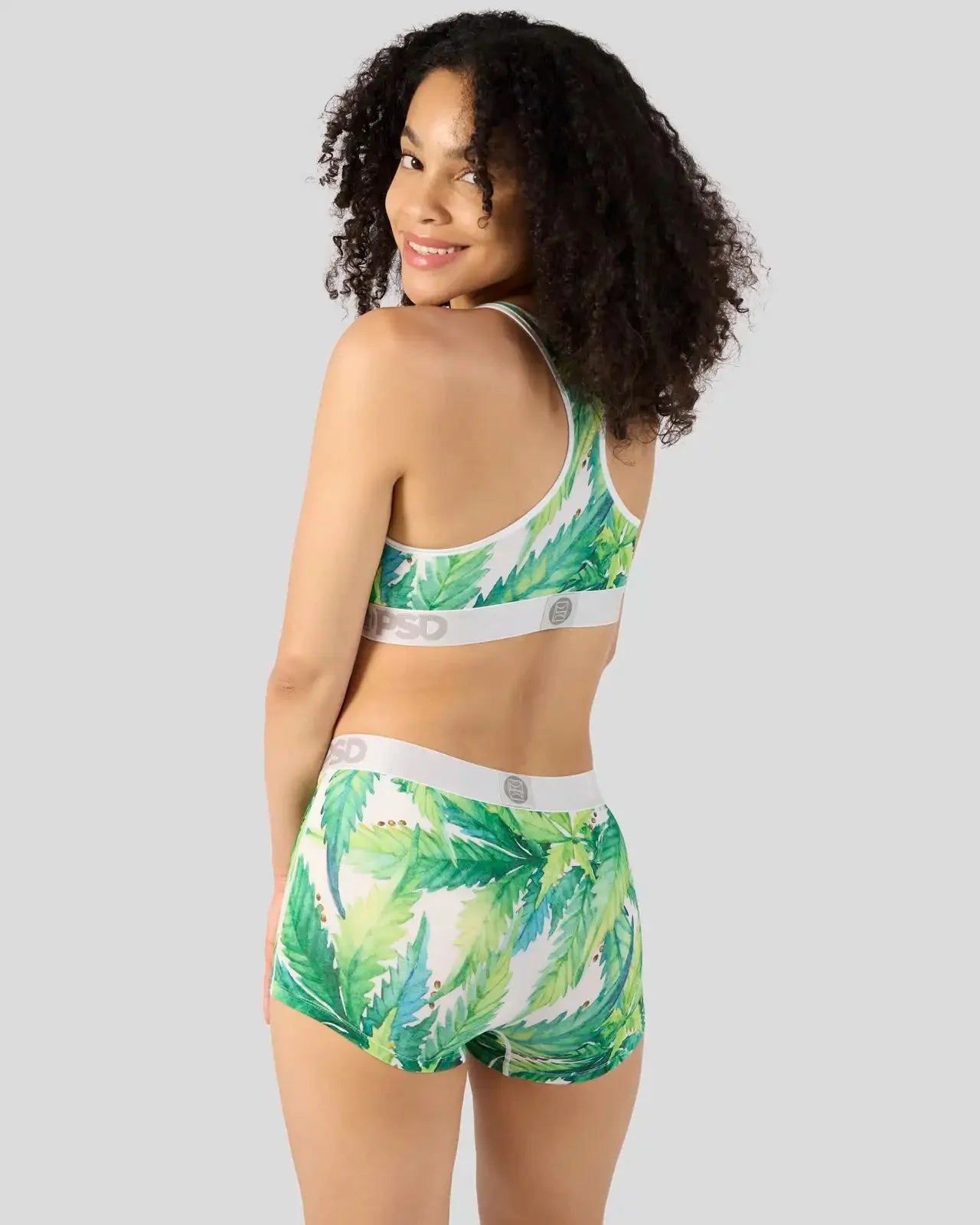 Stay lit in this greens-printed women’s pair. The Seeds and Stems Boy Short is made from a silky poly blend with a comfortable full coverage, keep-you-in fit. The PSD boy shorts are perfect for everyday wear and working out.