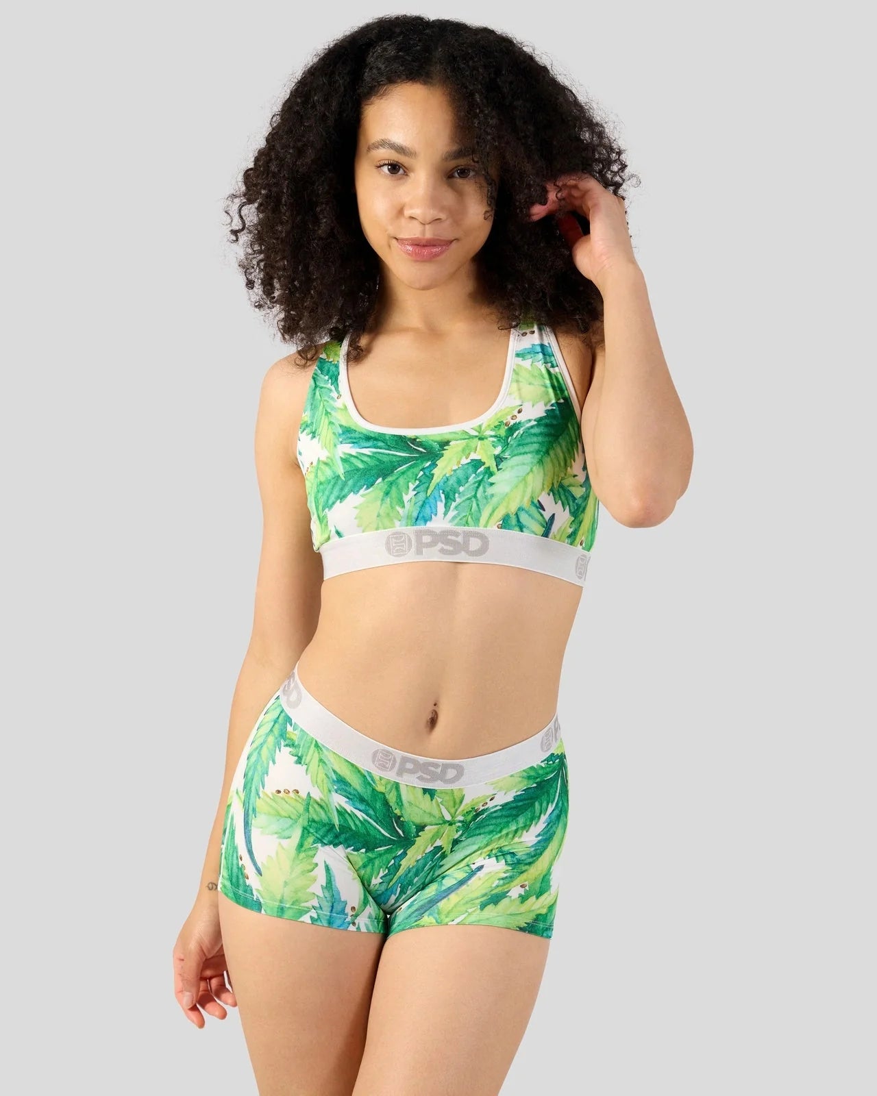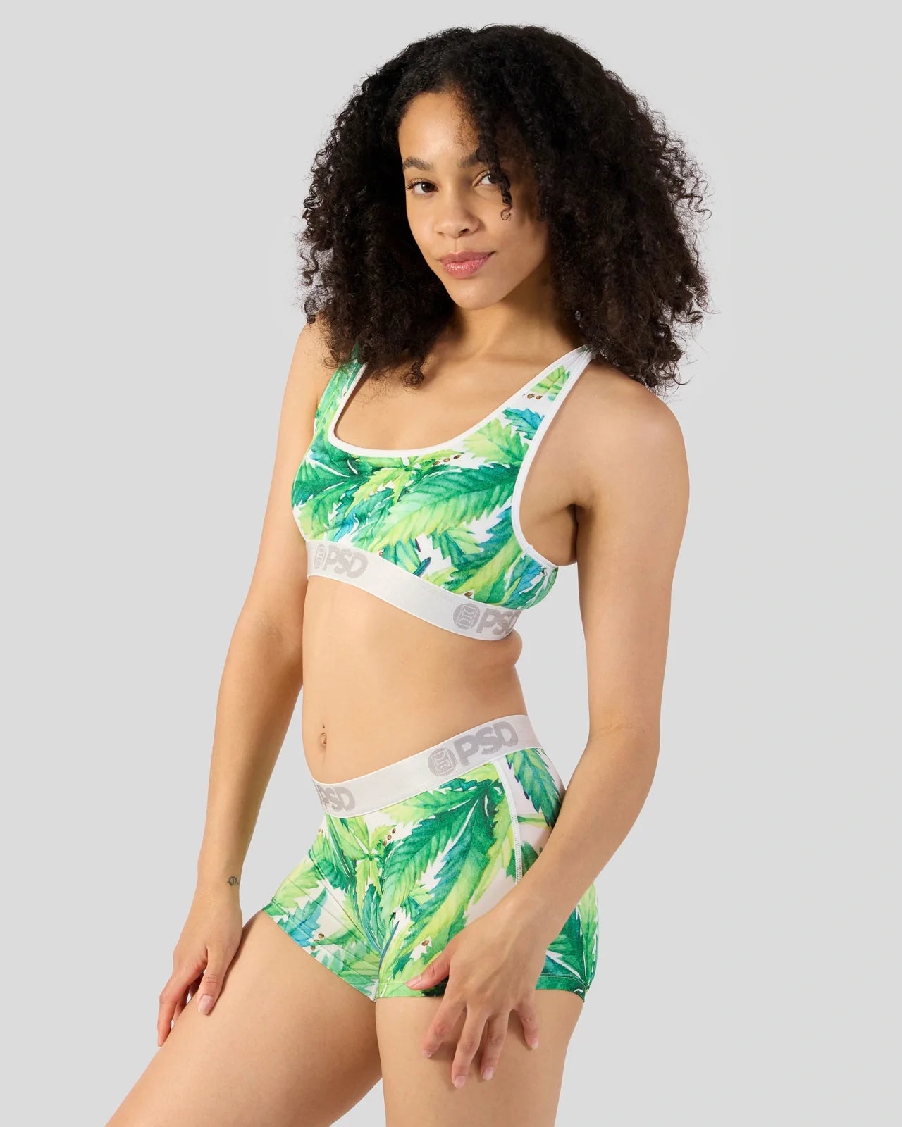 Stay lit in this greens-printed women’s bra. The Seeds and Stems Sports Bra is made from a silky poly blend and is breathable yet slightly compressive, bringing you the comfort and support you need for everything you get into.