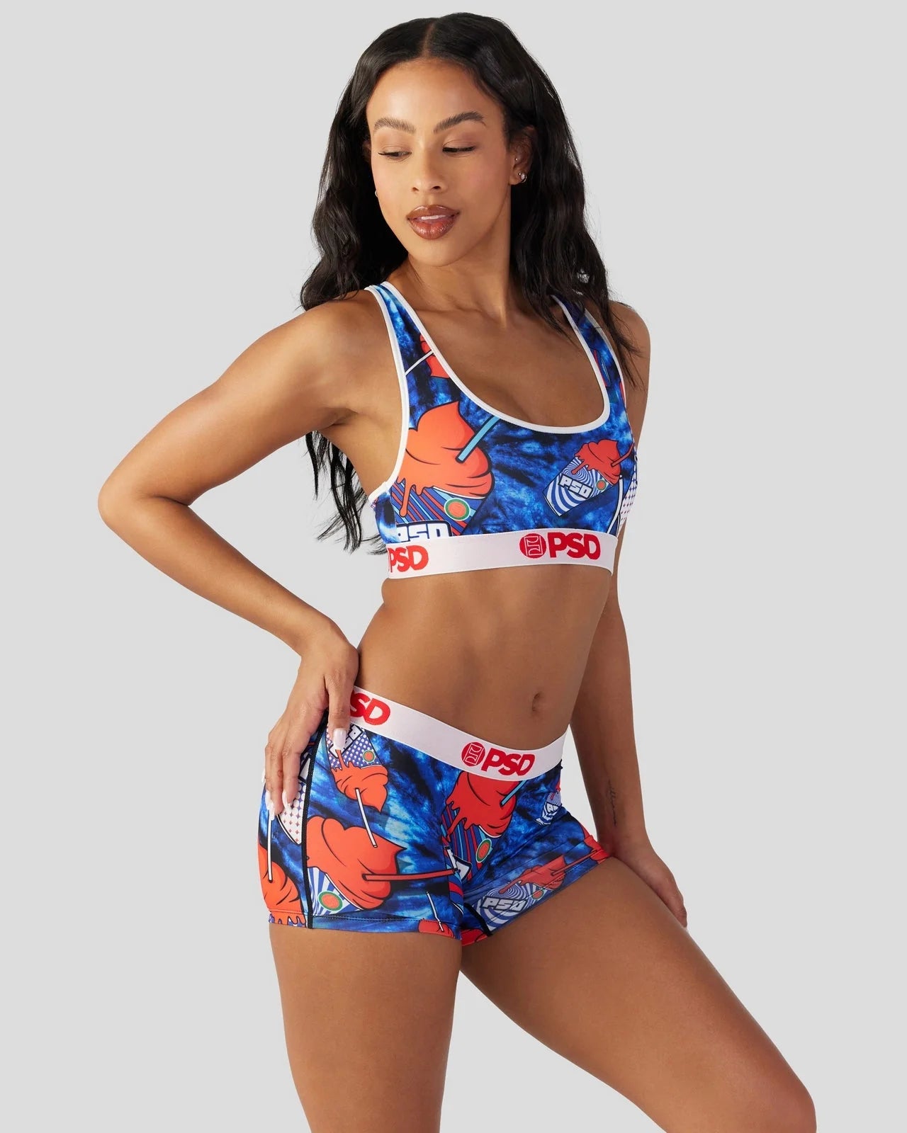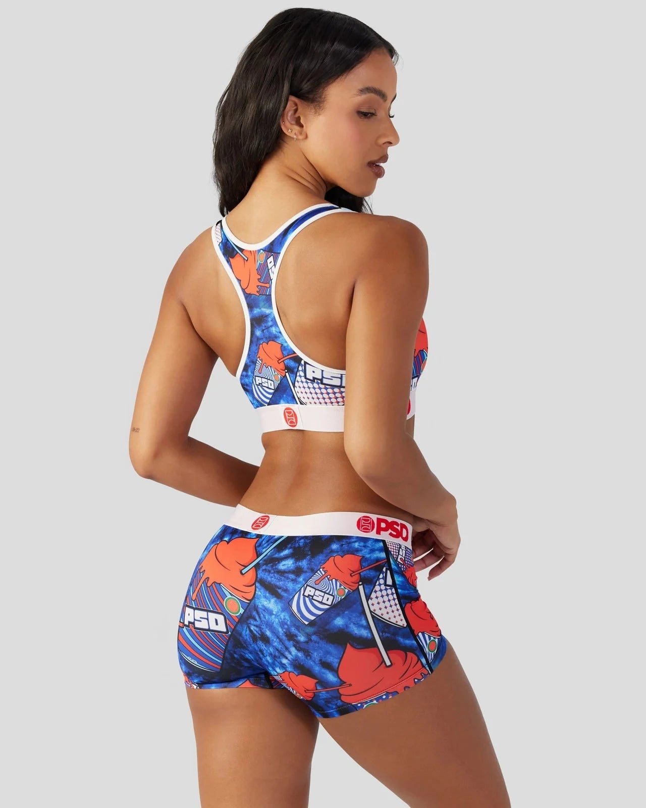 A refreshing new style so sweet you can almost taste it. The Slurp Sports Bra is made from a silky poly blend with a comfortable full coverage, keep-you-in fit. The PSD boy shorts are perfect for everyday wear and working out.