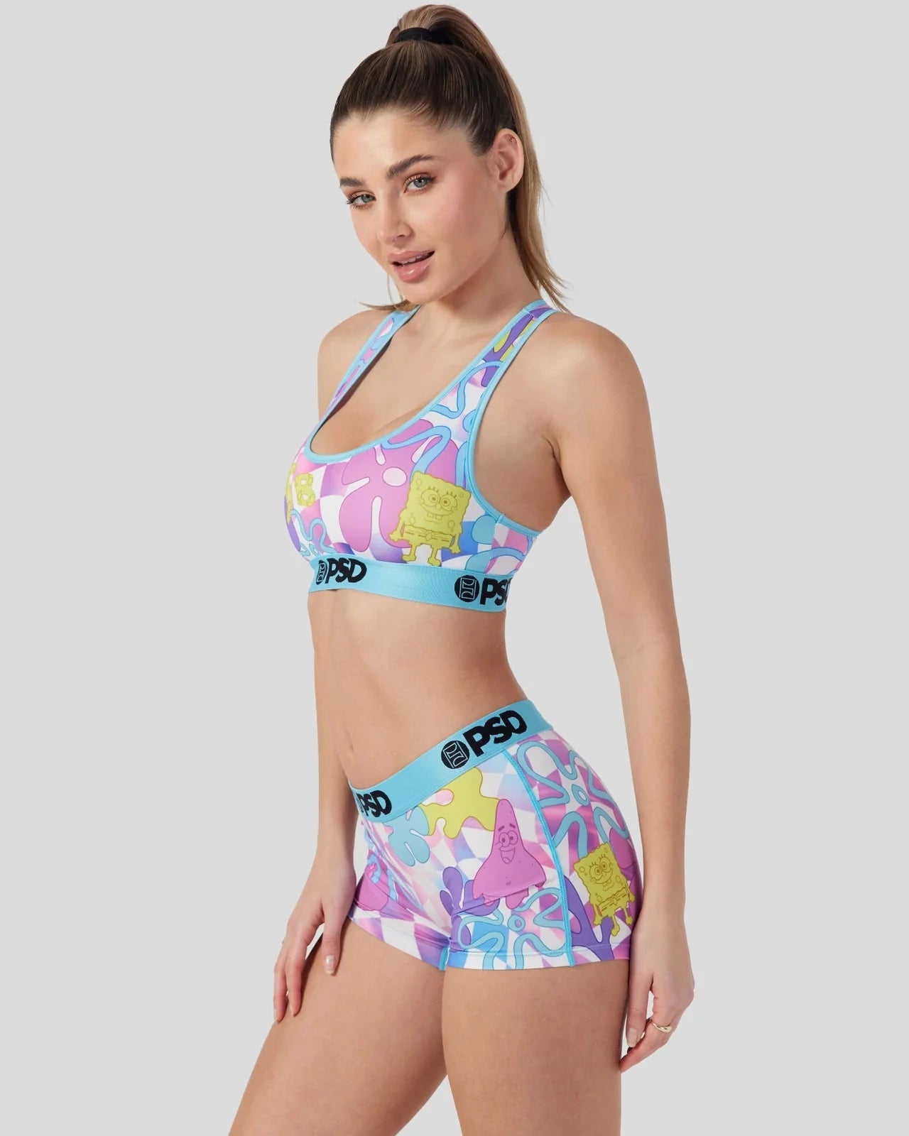 SpongeBob, Patrick, flowers, and checkers all in bright neon colors combine to create a new style you can't miss. The SpongeBob SquarePants Neon Check Sports Bra is made from a silky poly blend and is breathable yet slightly compressive, bringing you the comfort and support you need for everything you get into.