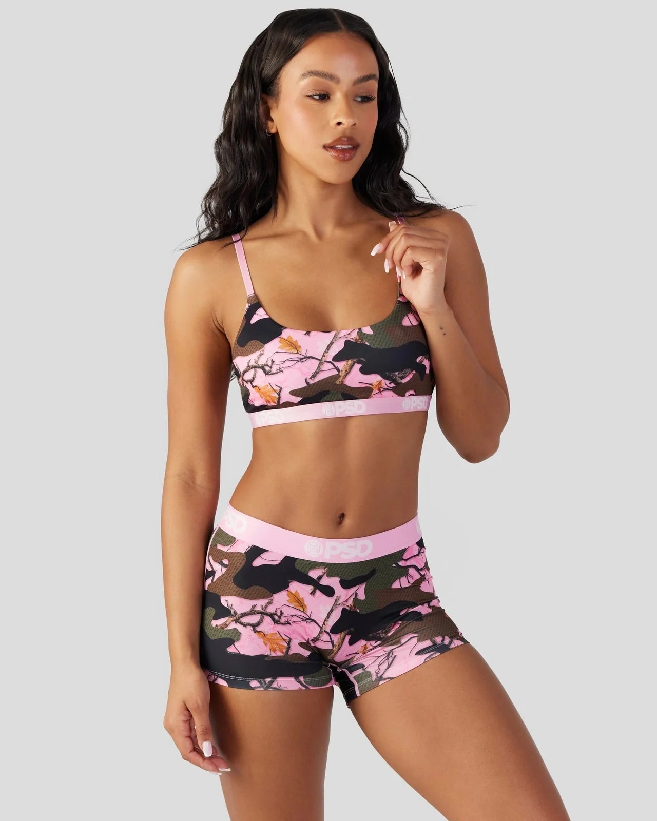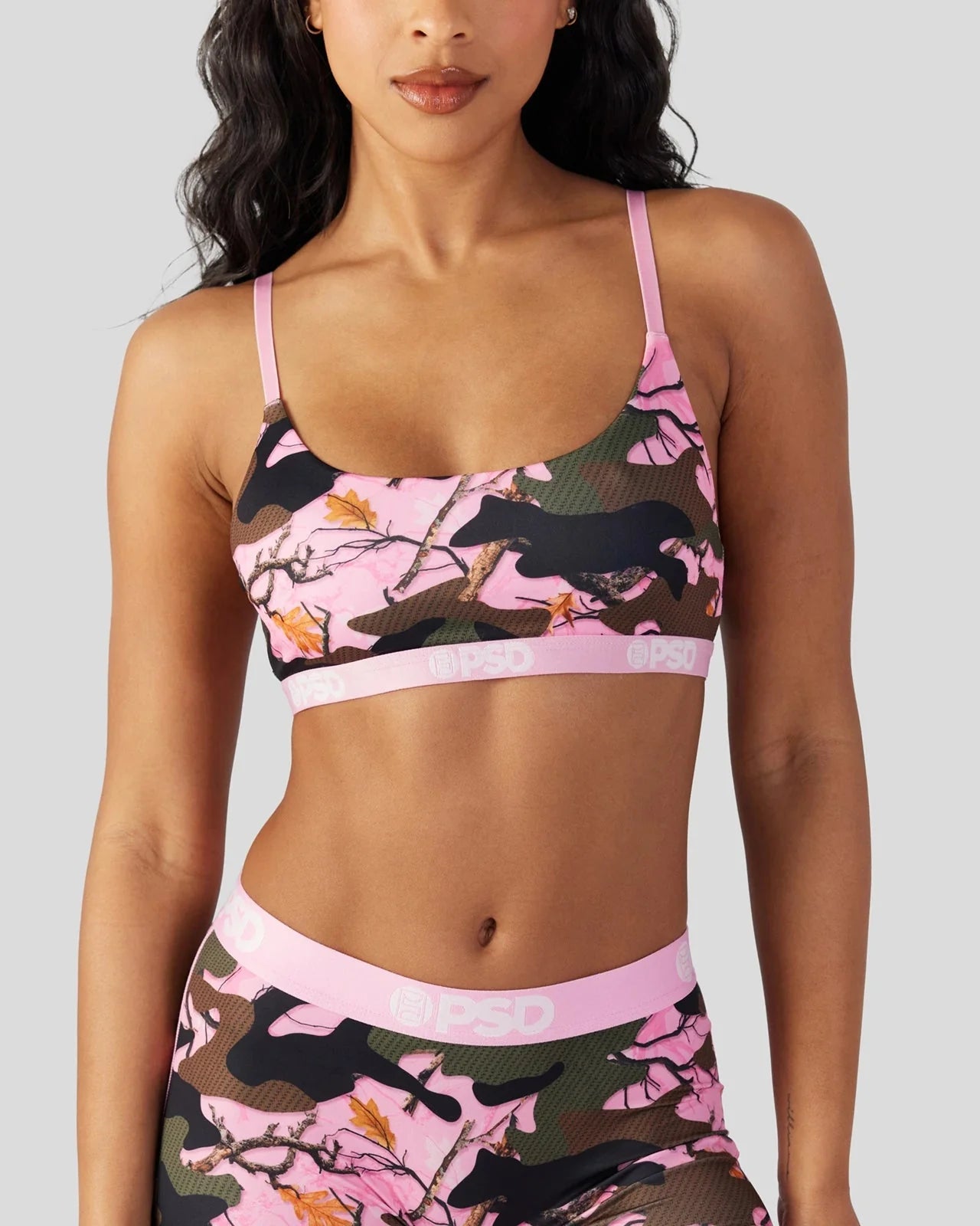Camo gets girly with this new pink print. Made of our silky poly blend, the Stealth Woods Scoop Bralette almost feels like you're not wearing a bra at all. It’s fully lined and features include adjustable straps, a cute scoop neckline, and a soft microfiber band that won’t ride or rub.