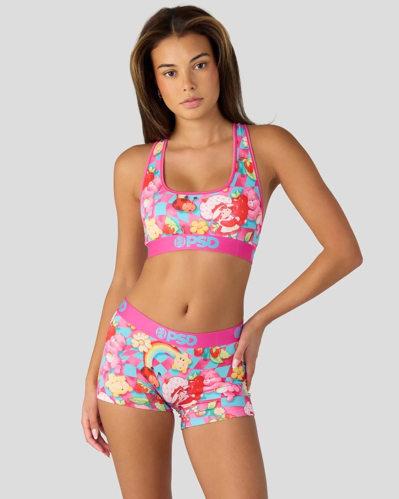 This Strawberry Shortcake x Care Bears x PSD is the super sweet crossover you've been dreaming of. The Strawberry Shortcake x Care Bears Trippin Sports Bra is made from a silky poly blend and is breathable yet slightly compressive, bringing you the comfort and support you need for everything you get into.