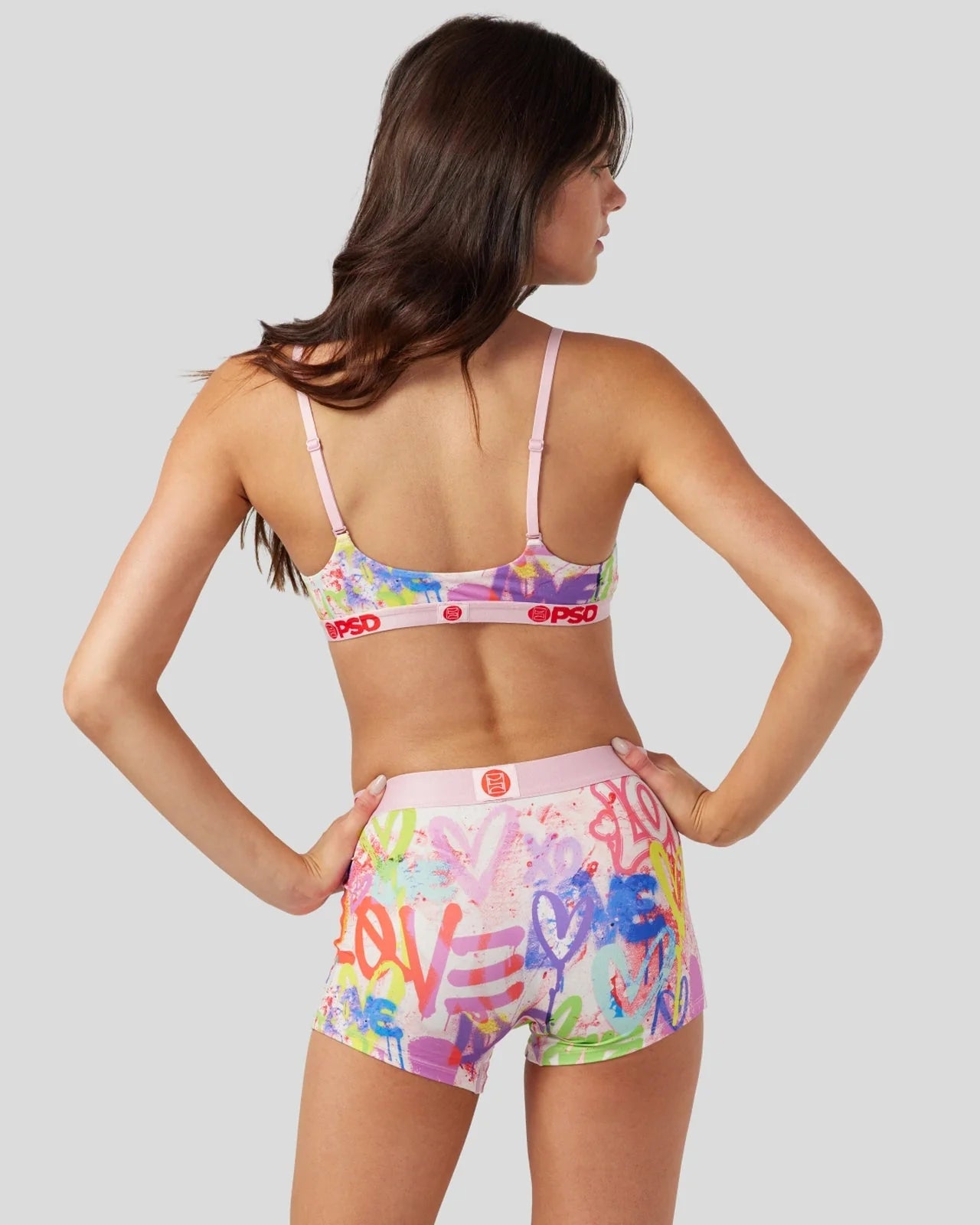 Our newest bralette shows off the softer side of street art with a tagging-inspired print you'll love. Made of our silky poly blend, the Street Love Scoop Bralette almost feels like you're not wearing a bra at all. It’s fully lined and features include adjustable straps, a cute scoop neckline, and a soft microfiber band that won’t ride or rub.