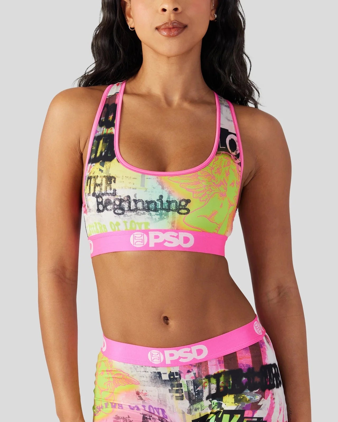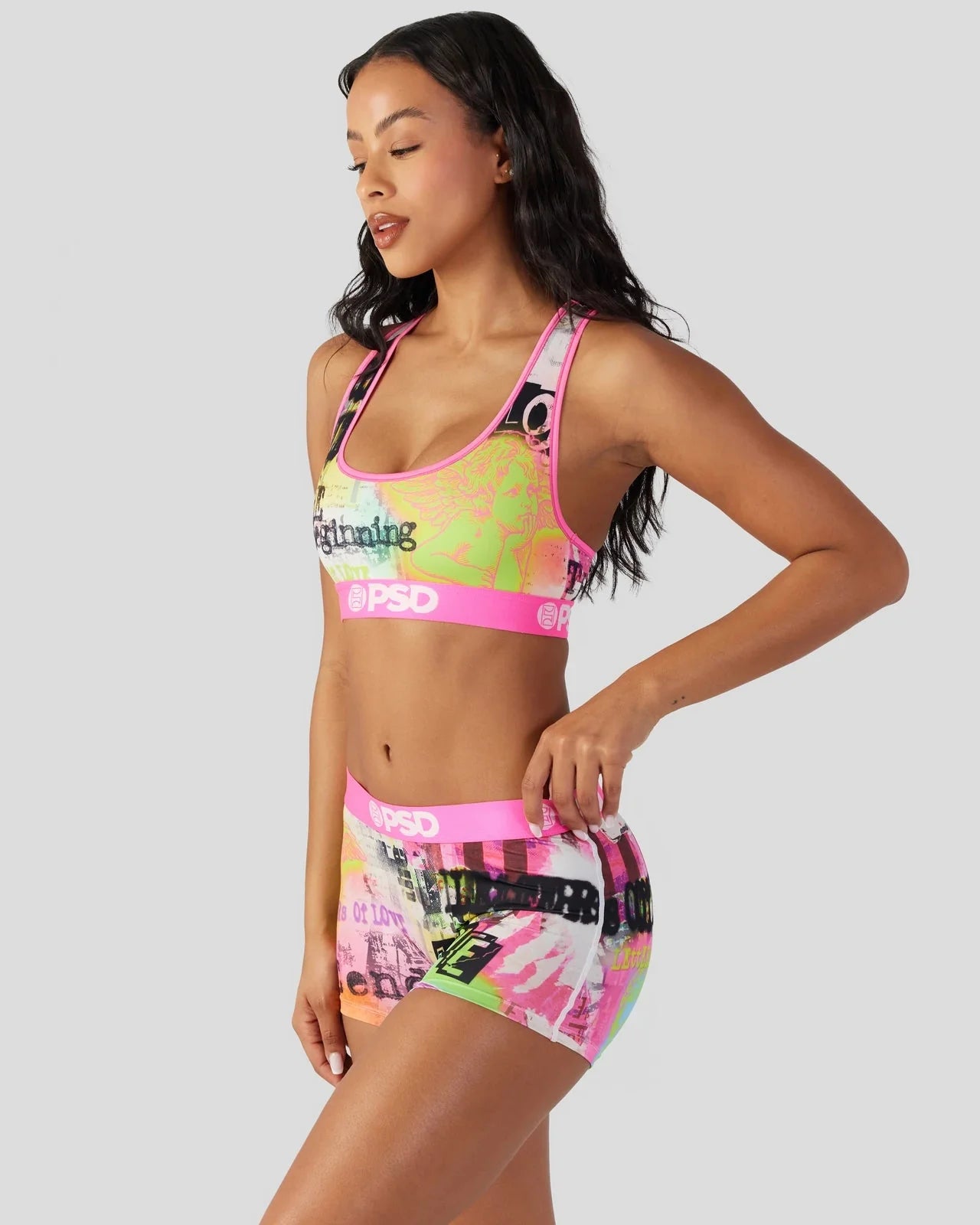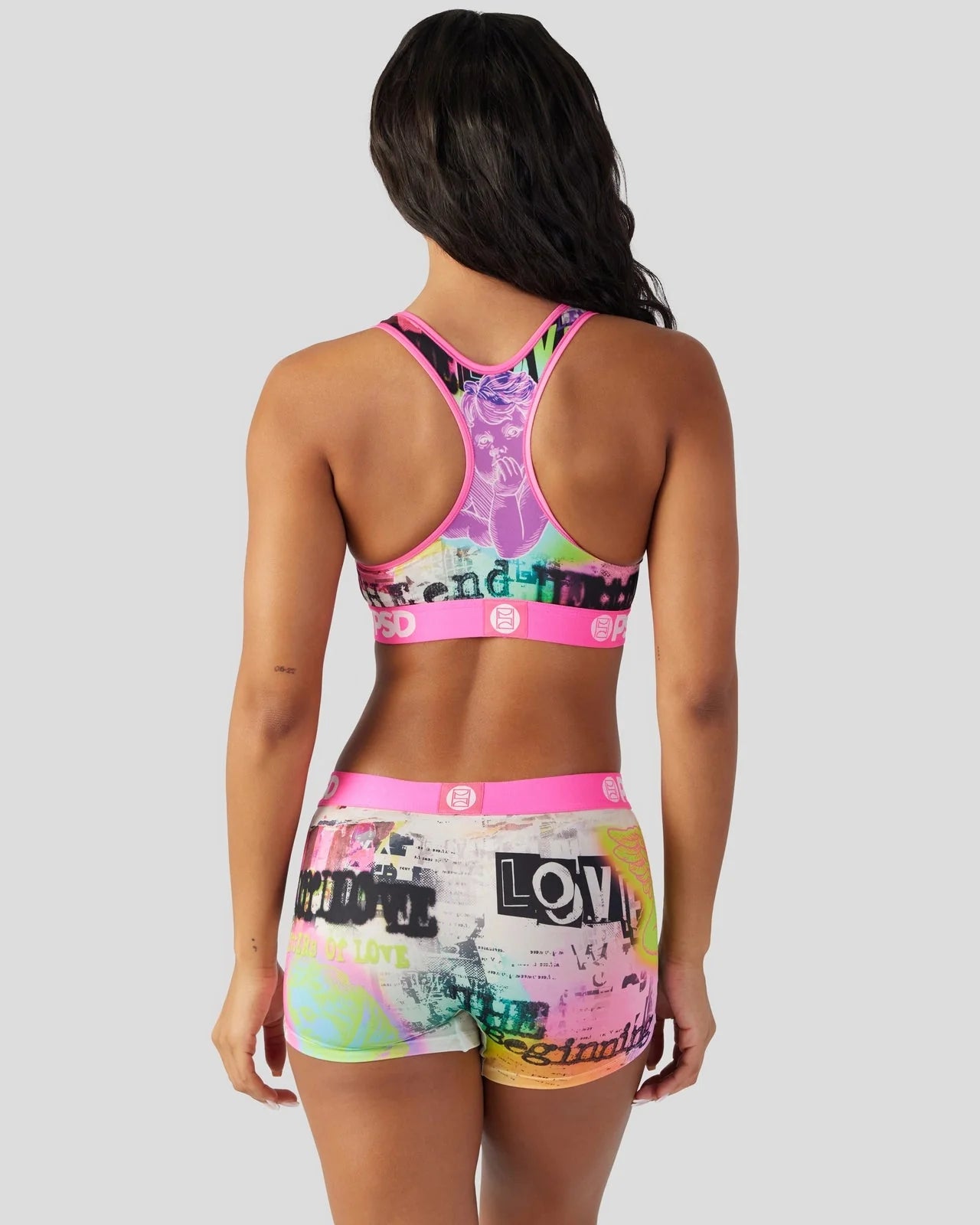 Add some edge to your collection with this ‘90-inspired grunge print. The Stupid Cupid Sports Bra is made from a silky poly blend with a comfortable full coverage, keep-you-in fit. The PSD boy shorts are perfect for everyday wear and working out.