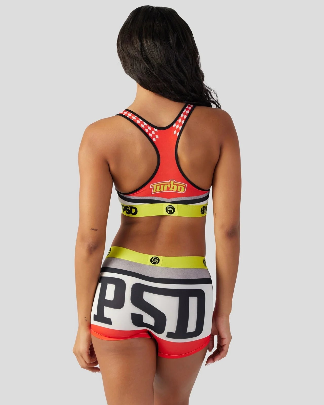Get ready to turbocharge your look with this racing-inspired pair. The Turbo Race Sports Bra is made from a silky poly blend with a comfortable full coverage, keep-you-in fit. The PSD boy shorts are perfect for everyday wear and working out.