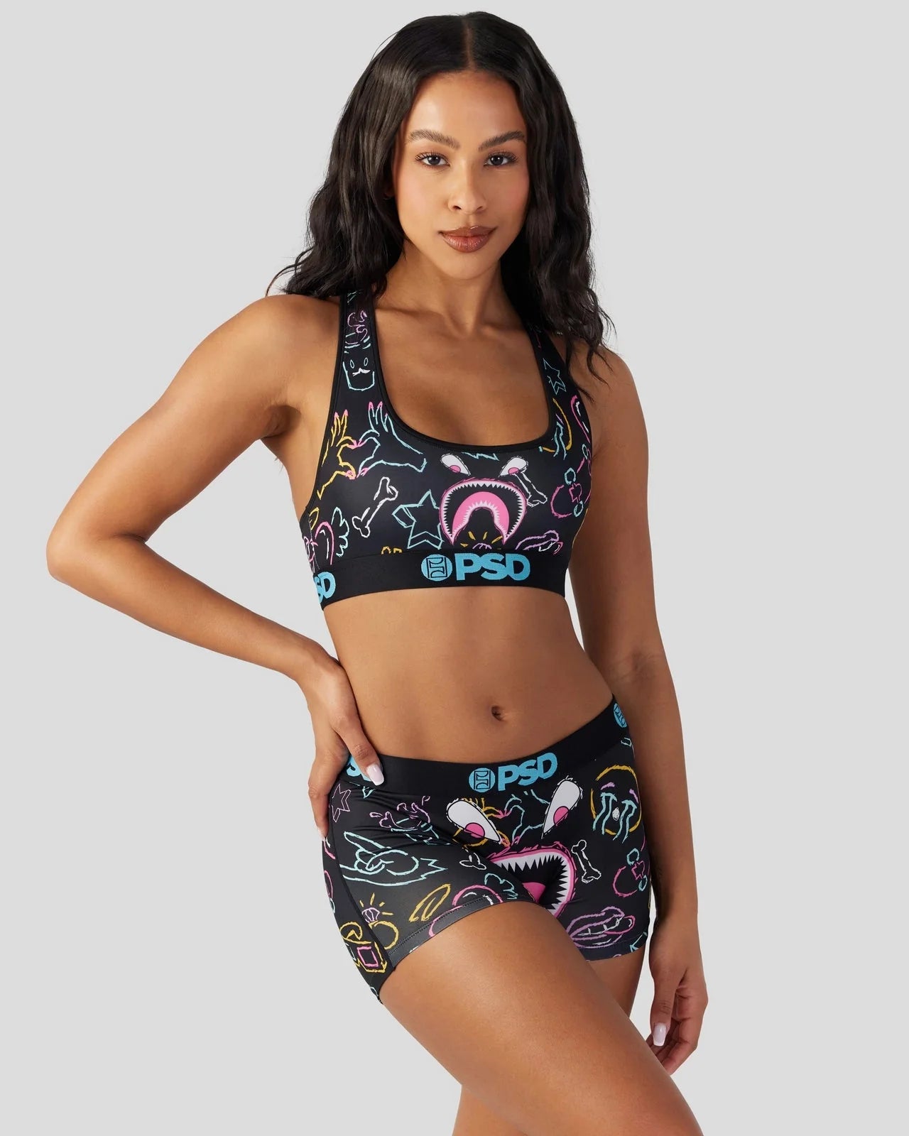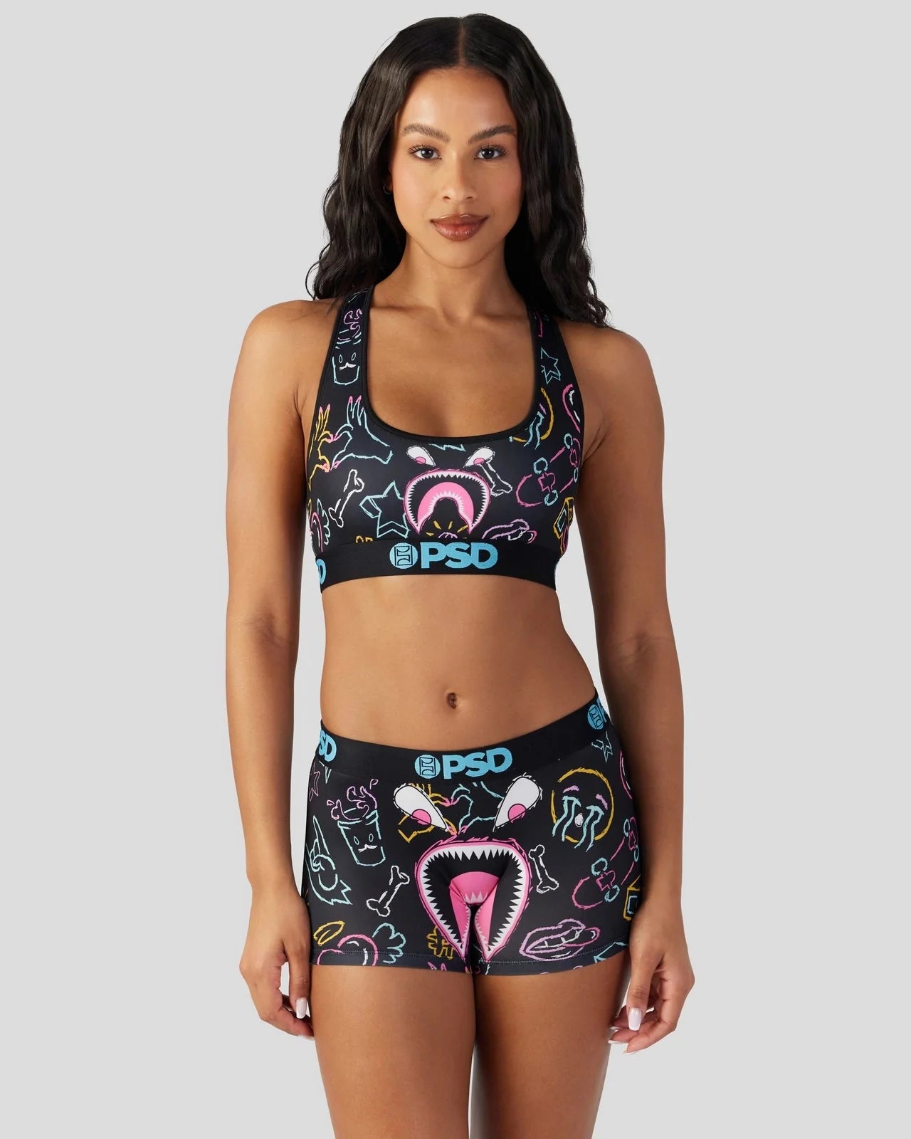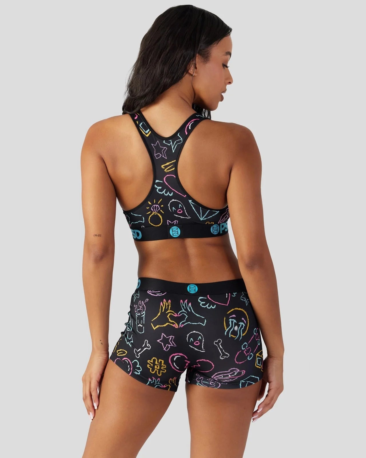 Introducing the latest Warface look to join the collection. Featuring our signature Warface alongside neon-colored doodles, the Warface Scribe Sports Bra is made from a silky poly blend with a comfortable full coverage, keep-you-in fit. The PSD boy shorts are perfect for everyday wear and working out.